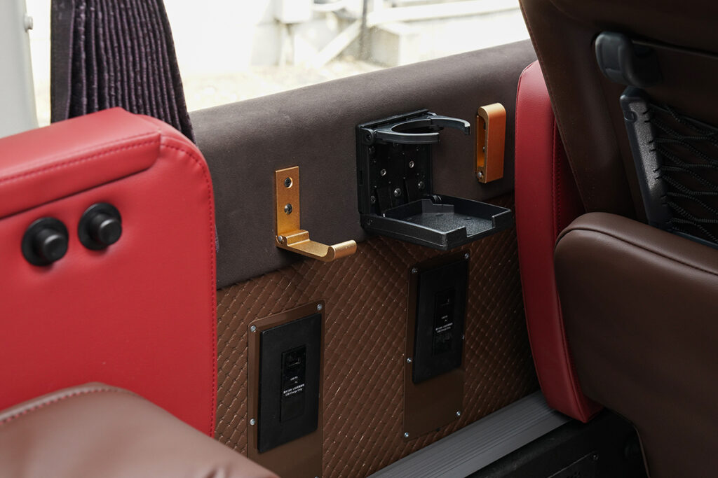 フットレスト、レッグレスト、ドリンクホルダーやUSBポートが各座席に装備されています。