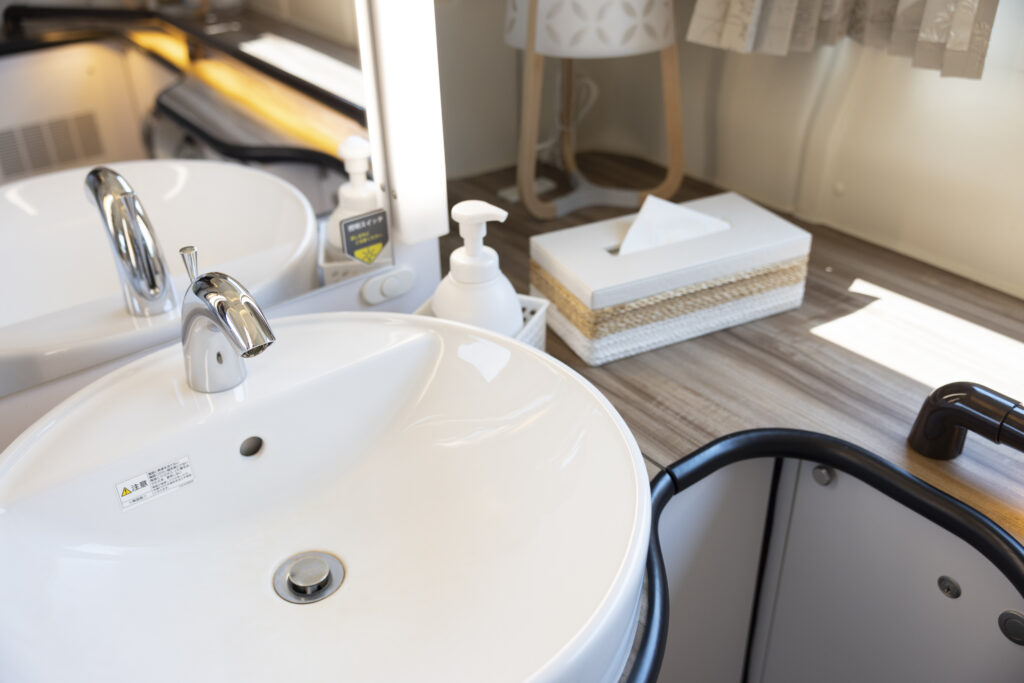 大型洗面台付きの広いパウダールーム調の化粧室をバスの後部に設置